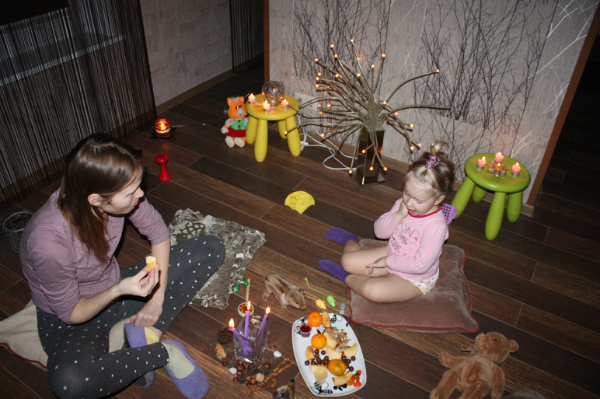 Тут сова рассказала, что в гости на праздник спешит сказка, только ей надо помочь разными звуками. Мы достали корзинку с музыкальными инструментами и исследовали, на что похож их звук. После этого началась сказка, а Алиса с папой помогали на муз. инструментах. Сюжет не перескажу весь, но в общем про лошадку, потерявшуюся в лесу, и как на нее волки напали, а ёжик прогнал их палкой с огнем,позвал лошадку к себе, но она хотела поскорее к маме в конюшню и тогда во всем лесу заглись волшебные фонарики и она убежала. А ёжик с другом мишей легли спать. Пока они спали осень закончилась, началась зима, погасли фонарики, взошло солнце и выпал снег. Когда они вышли на улицу, то увидели много следов, прибежал Заяц и поздравил их с первым зимним днем! Осенняя сказка закончилось, пришло время зимних