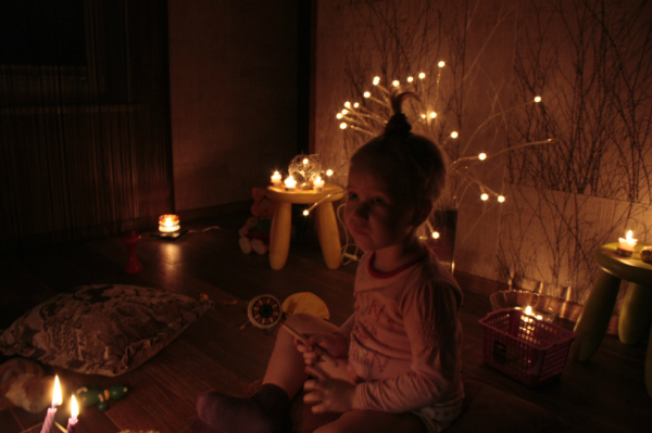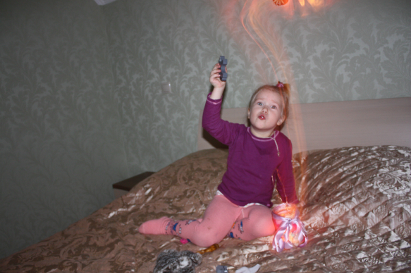 Алиса изображает волка:) Это было волшебное занятие в темной комнате, мы поставили фонарик на кровать и на потолке образовался кружок света. Смотрели разные тени от игрушек, показывали руками. Завораживает