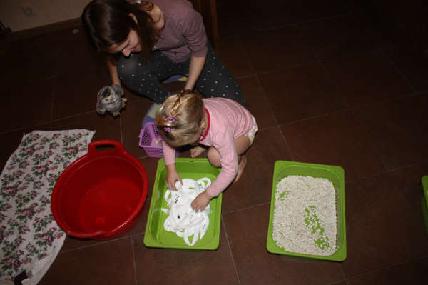 На следующий день Алиса с фонарико, мамой, папой и бабушкой:) отправилась в путешествие на лесную поляну. Сова рассказала, что сначала мы пойдем по снежной дороге, потом перейдем ветренной поле, спустимся с горы и попадем на поляну. Сначала пришлось откопать некоторых гостей (жуков и лягушек), которых занесло на снежной дороге (три контейнера с манкой, белой фасолью и пеной для бритья