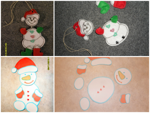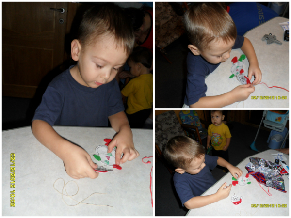 Дима тут же приступил к работе))) прикрепил валенки (на кнопках), голову к туловищу (на крючке) и продел ниточку)))) Получилась ёлочная игрушка)