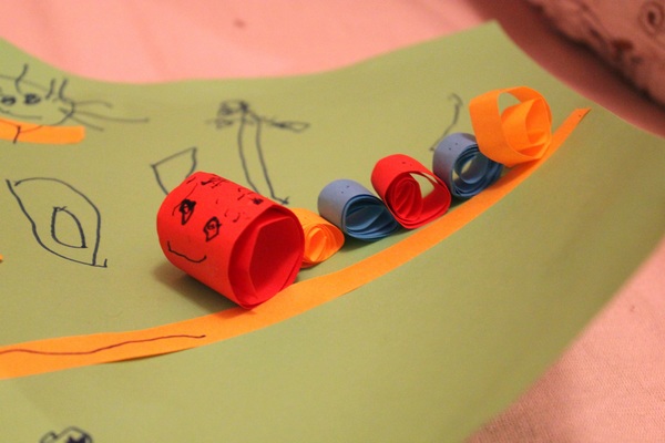 А для мелкой моторики ребёнка очень полезно учиться рвать полоски на мелкие кусочки. Не у всех деток это сразу получается. На большие куски рвать легко, а маленькие - гораздо сложнее. Мы время от времени тренируемся)) Или можно ещё скатывать рулетики. Тоже не так просто для ребёнка, но зато и красоту он тоже может сотворить из них. Знакомьтесь, гусеница!!!))