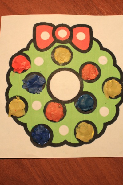 3.Из предновогодних забав - украшали рождественский венок пластилиновыми шариками. Делает это Андрюшка уже более старательно, старается не вылезать за контур.Очень меня этим порадовал.