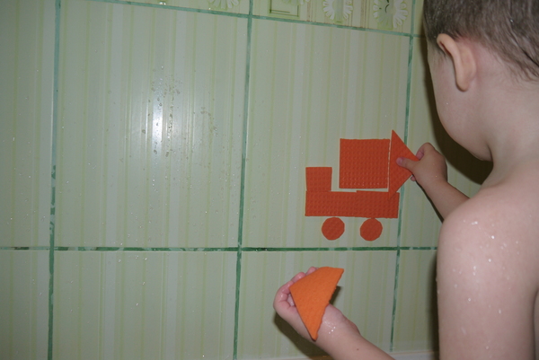 У нас сейчас любимые гелевые наклейки (стоят рублей 30) - лепим на ванну, на плитку, купаем, собираем в ведерко. Тоже есть фигруки из губки, при желании можно купить такие же аква игрушки.