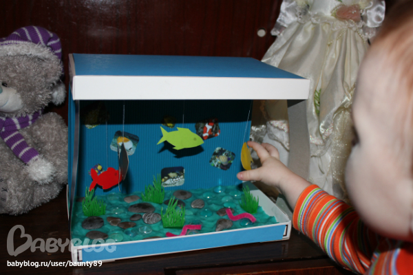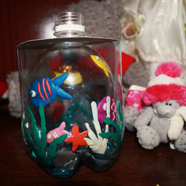 Сделан из двух бутылок, одна 2л., вторая-1,5!Водоросли приклеены внутрь 2л.бутылки, а рыбки-снаружи 1,5л, когда вставили бутылки одна в одну, получился аквариум! Вращаем внутреннюю бутылку за горлышо и наши рыбки плавают!