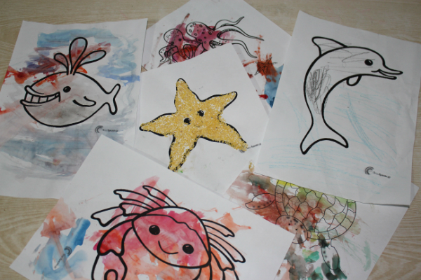 Когда краска высохла, мы опять посмотрели видео и начали заселять наше море рыбками, которые я заранее приготовила из самоклеящейся бумаги!