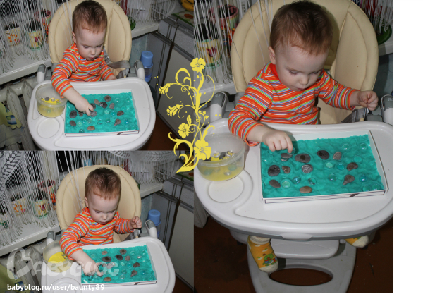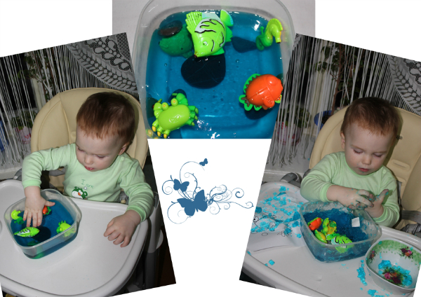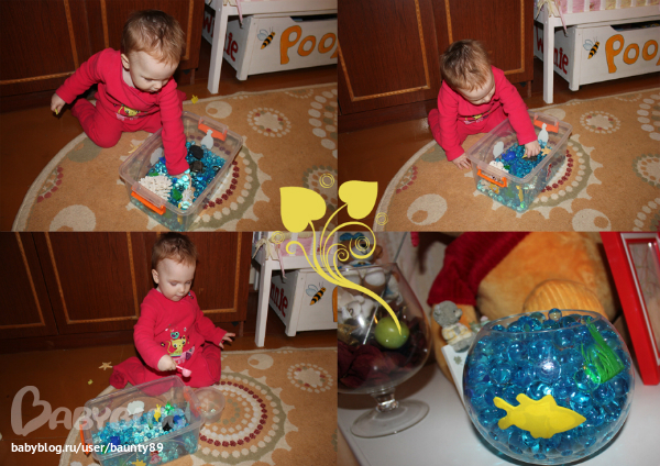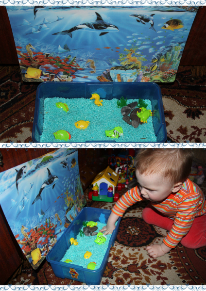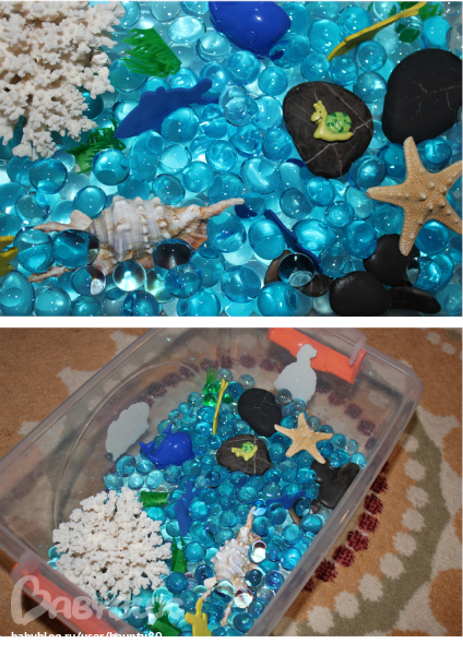 Сначала мы просто изучали наше море, потом с помощью ложечки перекладывали шарики в другую ёмкость, а когда вдоволь наигрались, сделали мини-аквариум!