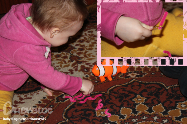 Потом решили накормить рыбку червячками с помощью пинцета! Получалось через раз! Ручками, конечно же, удобнее!)))