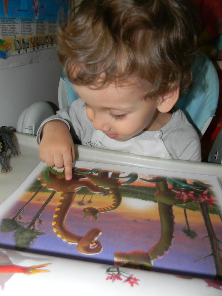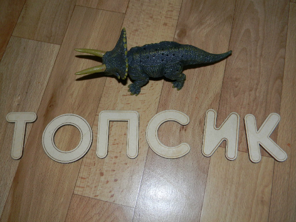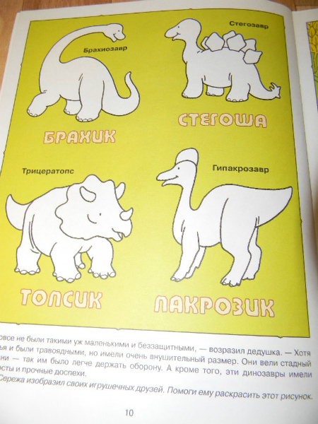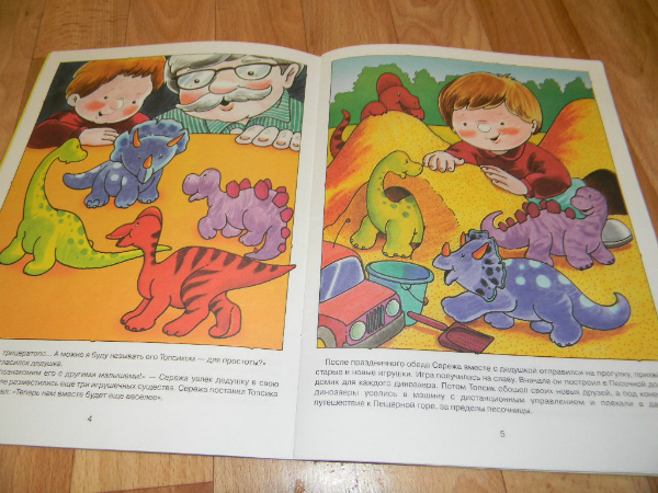 имя мальчика Сережа заменяла именем сына (ребенку так больше нравится) в книге мальчик дал динозаврикам сокращеные имена Трицератопс (Топсик) брахиозавр (брахик) и т.д. Санька запомнил их с легкостью и так и называли их, причем я объясняла что это трицератопс просто мы его будем топсиком звать.