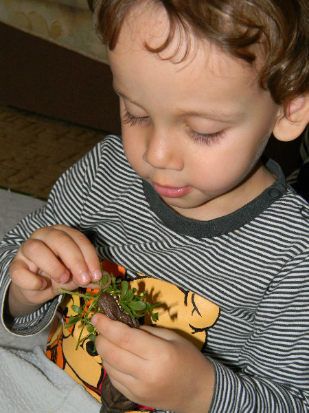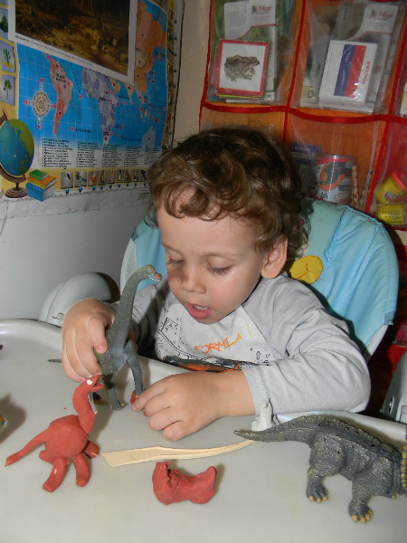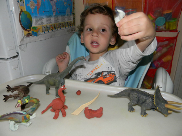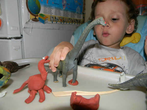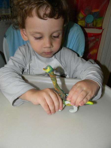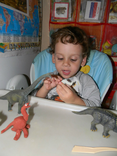 Лепили динозавров, точней я говорила сыну что нужно слепить показывала как сделать, он повторял за мной, шаг за шагом , помогла нам и