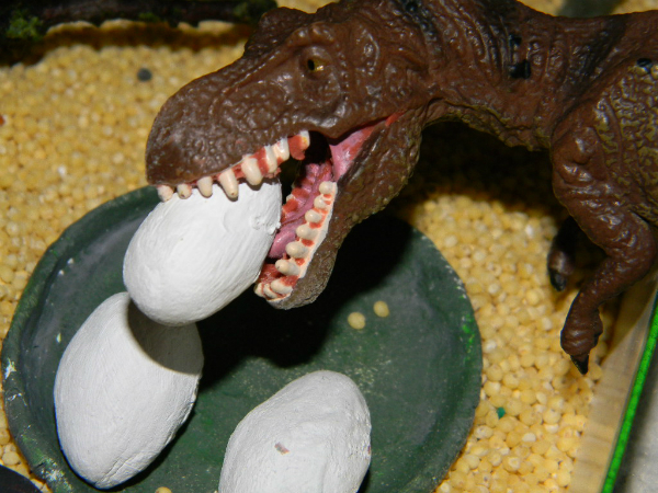 Тиранозавр попытался украсть яйцо но получил мощную атаку от брахика и больше не варовал яйца а кушал травку (так Саша решил)))