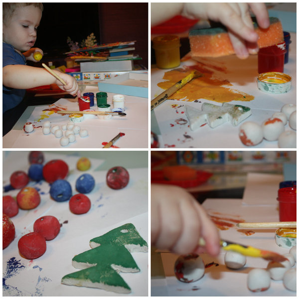 Ну а остальные "елочные игрушки" он уже красил в свое удовольствие и пальцами, и губками, и кисточками, заодно не забывая украсить стол и бумагу)