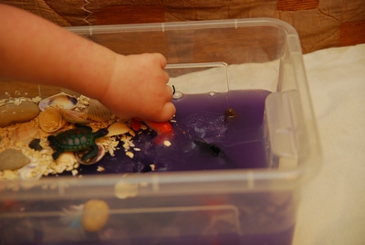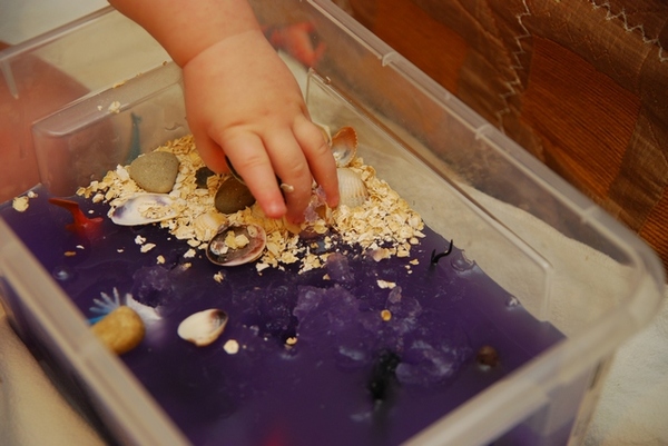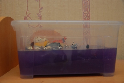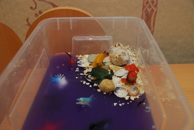 3 столовые ложки желатина залила 3 стаканами холодной кипяченой воды, дала постоять 60 минут для набухания, затем нагрела всё это содержимое до растворения желатина, вылила в контейнер и добавила 6 стаканов подкрашенной гуашью воды. Потом половины перелила в другую чашку, а в жидкость, оставшуюся в контейнере поместила несколько рыбок, поставила в холодильник для застывания, после застывания сверху положила остальных рыбок и залила оставшейся половиной раствора, снова поставила в холодильник для застывания.