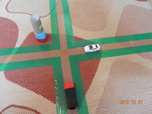 Для изготовления дороги потребуется упаковочный скотч для дорог, прозрачный скотч и полоски белой бумаги для изготовления пешеходного перехода, а для светофора - две картонки от туалетной бумаги, вставленные друг в друга, с вырезанными кружочками на одной и окрашенными на другой, так можно менять свет на светофоре - это разработка нашего гениального папы, который, конечно же, сразу подключился к разъяснению сыну правил дорожного движения.
