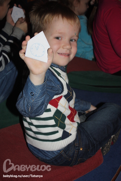 В самом конце всем деткам подарили бумажные нарисованые часы, которые надо было разрисовать морозным узором.