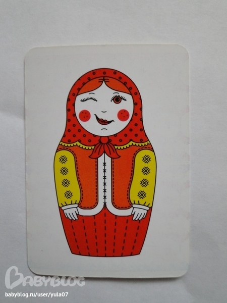 Настольные игрыСуть игры в том, что нужно быстро находить нужные матрёшки и показывать их особые жесты.каждый раунд один из игроков становится ведущим и вытаскивает из колоды одну карточку с цветами. После внимательного изучения самой карты, он находит матрёшку в тех же цветах на столе, сравнивает движения и быстро выкладывает свою карту на стол. Игроки должны сравнить цвета на новой карте и уже имеющихся и повторить то движение, которое показывает соответствующая матрёшка. Например, если на карте красный-белый-зелёный, то нужно найти красно-бело-зелёную матрёшку. Если она прыгает, тоже подпрыгнуть.