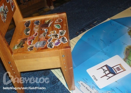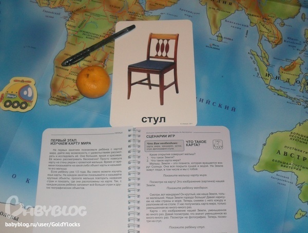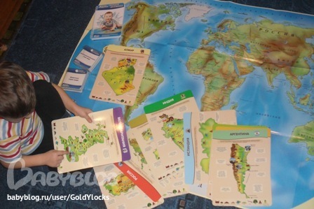 Здесь наше первое занятие и знакомство с комплектом. Увидев огромную карту мира, большие путеводители, карточки с животными, растениями и достопримечательностями, сын был занят рассматриванием целый вечер!!!! Ни разу он не занимался чем-то так долго. А еще плюс, что он сам читал все названия на карте.