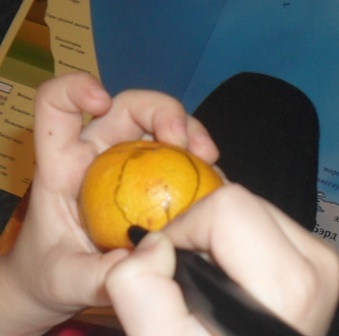 Рисуем материки на мандринке, чистим ее и раскладываем на плоской поверхности. Рассказываем о том, что карта - плоское изображение Земли.