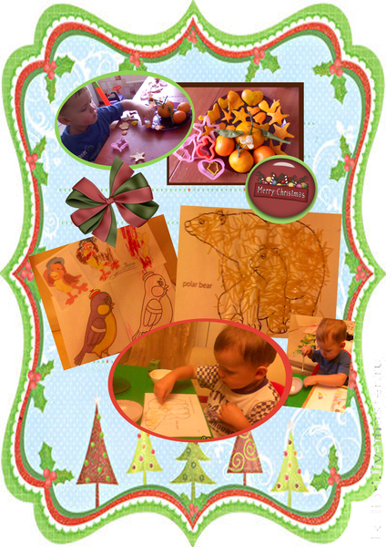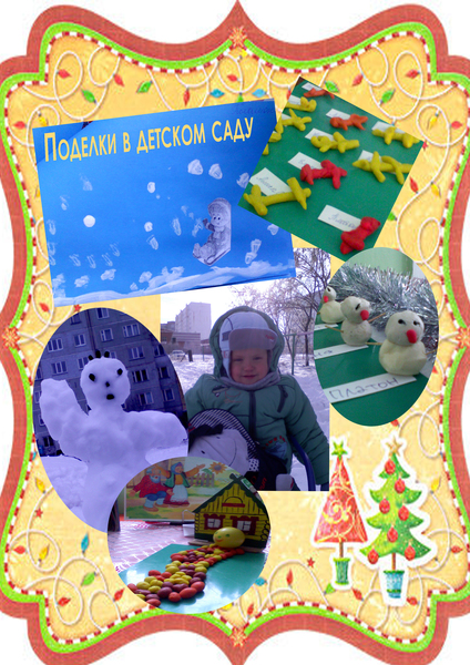 Это шедевры,созданные нашим малышом в детском саду (жаль вот только,что мы опять заболели,проходив в садик всего лишь недельку): самолетик, снеговик и дорожка для колобка пластилиновые, и снежинки с сугробами гуашевые. и наша снежная баба из первого снега и короны из семечек.
