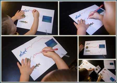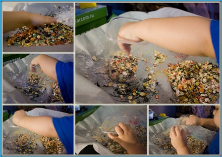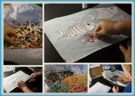 А дальше опять даем волю нашей детской фантазии + ёмкость, в которую ссыпаем оставшуюся "чешую" - отличное занятие для маленьких ручек - массаж ручек очень полезен для них