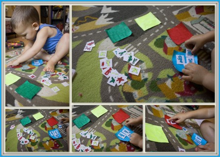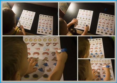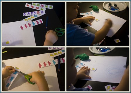 Тренируем нашу руку - режем ножницами, и тренируем внимание - ищем лишних, заодно повторяем цвета