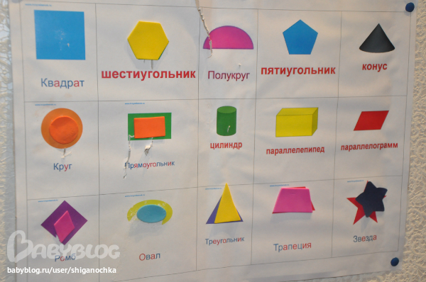 Потом вешали на стену карточку, потом рисовали, искали фигуру в книгах, клеили аппликацию. И так с каждой фигурой.