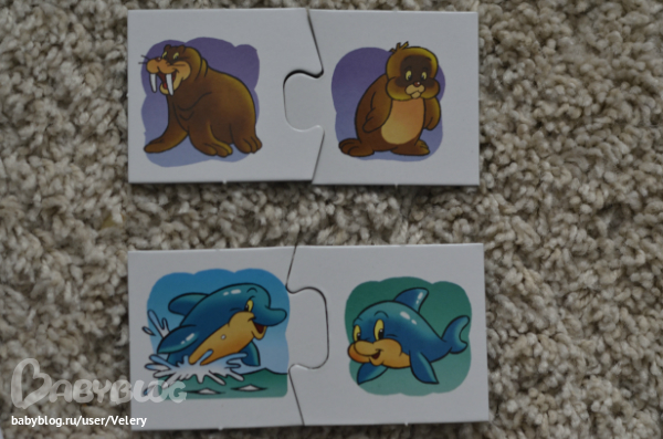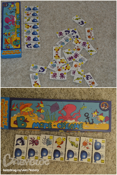 Играли в домино, но не согласна правилам инры, а придумали свои: брали по стопочке и просто клали на пол по очереди, искали определенное животное или рыбку, перевернули карточки рубашкой вверх и по одной переворачивали опять ища определенное животное, выбирали карточки с определенным животным(на фото кита отобрали).