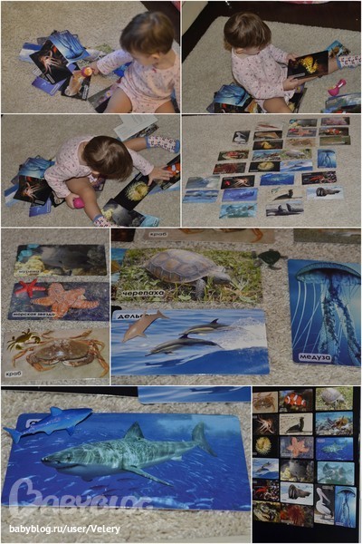 2. Карточки. Были только от Умницы, мы их давно разглядываем, больше брать не стала. Карточки рассматриваем вместе с Машей). Потом расставляли на карточки наших морских друзей, а затем вместе их клеили на шкаф. Днем изучали, я насильно ее к ним не водила, она сама к ним постоянно подходила и меня вела, а вечером обязательно сдавала экзамен у папы)