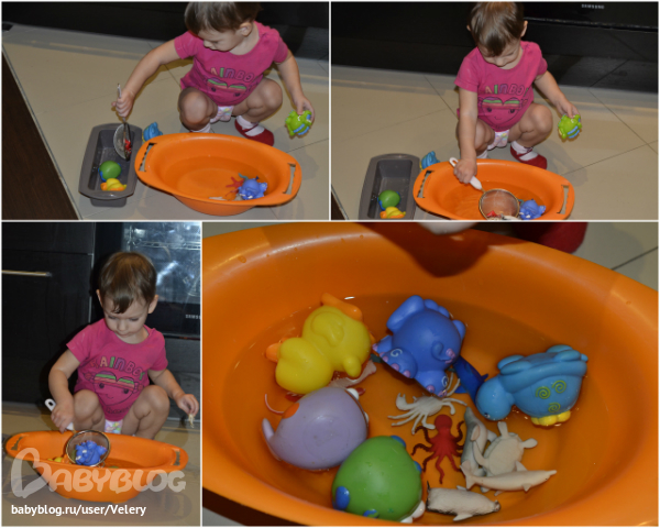 Доставали наших животных из водички ситом. Эту и прошлую идею взяла у Инны, у нее еще есть отличные варианты игр с водой.