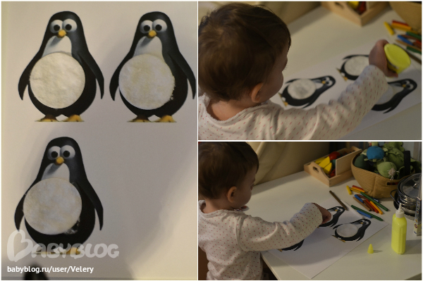 Мягкие животики из ватных дисков у пингвинов. Милана сама практически все делала:и клеем намазала и приклеила.