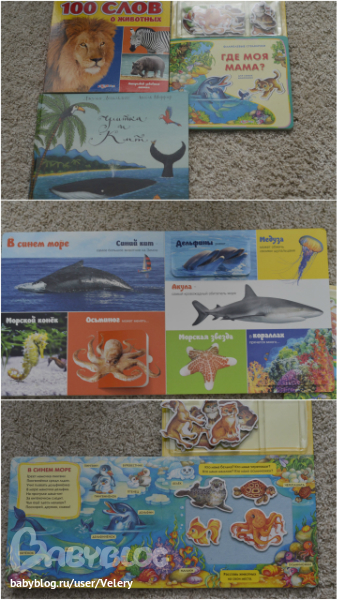 Про 100слов с открывающими страничками я уже писала и про книгу с фетровыми страничками тоже. Морские развороты покажу. Обе книги у нас давно, мы их ативно используем и нежно любим, рассматриваем и "читаем" самостоятельно.