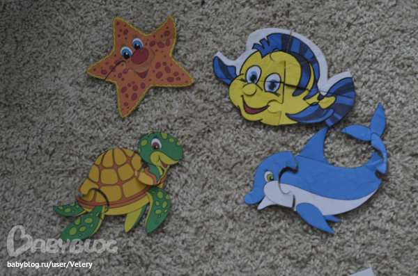 Пазлы самоделки пошли на ура, но неудобно очень, плохо держаться между собой. И если кто-то будет делать, то у рыбки белый контур нужно весь оставлять, а у черепахи и дельфина лучше хвости "не отрезать", еще был морской конек, но Милана его затаскала и в конце-концов оторвала хвост.