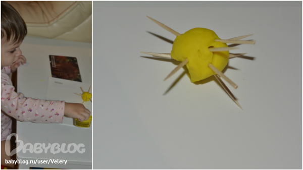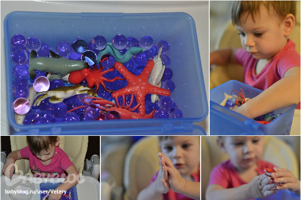 Типо сенсорной коробочки "Океан", перекладывали шарики в другую посудину(они мягкие и скользкие, поэтому это было непросто), доставали и рассматривали животных, а потом Милана видимо решила,что это пластилин и стала шарики катать.