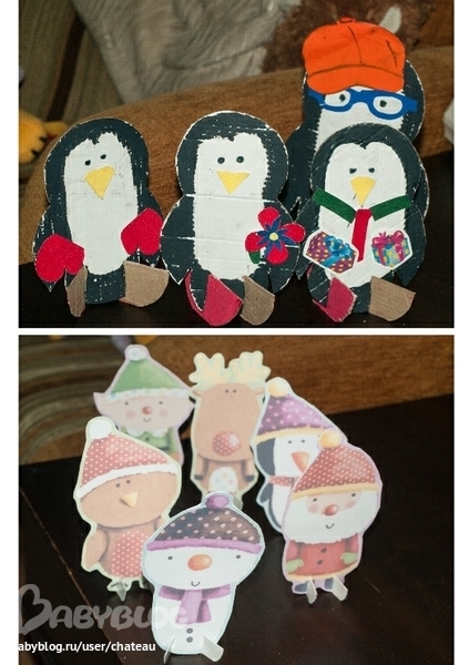 Нарисовала пингвинов на белой коробке из под школы семи гномов, вырезала, раскрасила, подготовила каждому нос и аксессуары из самоклеящейся бархатной бумаги.Украшали пингвинов вместе с сыном, клеили носы, очки и т.д. Мячом сбивать сын не хочет, у нас для этого машинки. Игра продержалась 2 недели, начали отваливаться носы, да и сын их немного поломал. Сегодня пришлось клеить новый вариант.