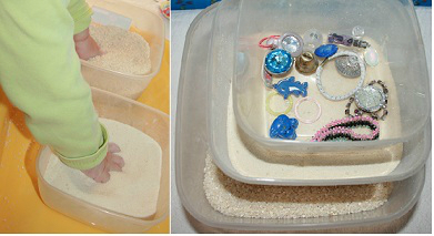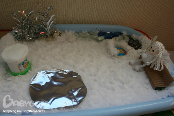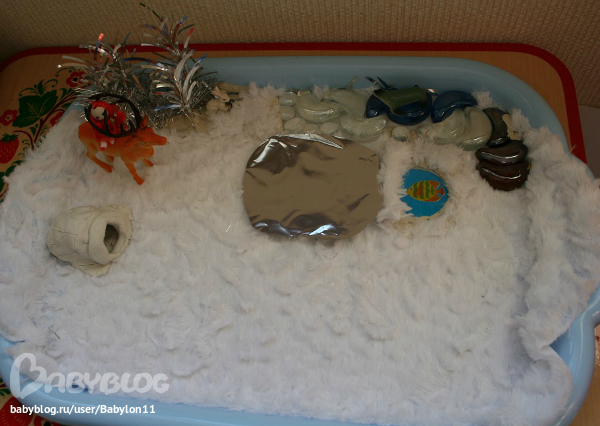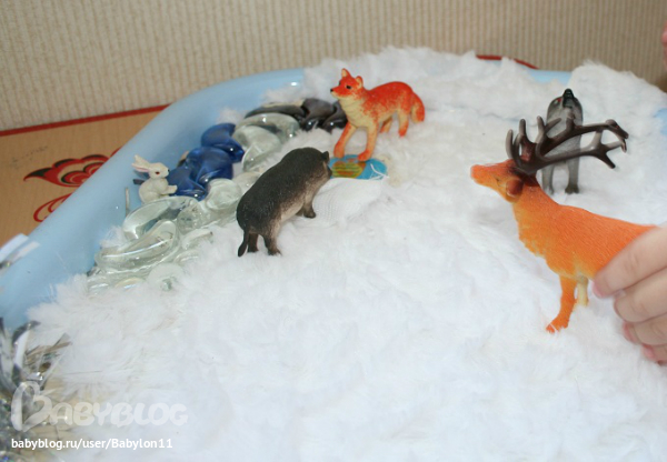 5) раньше я представляла сенсорную коробку примерно в таком виде, плюс еще животные по теме, но ее мы оставили отдельным пунктом - игра с крупой (манка и рис). Муж говорит, что больше похоже на поиск сокровищ на песчаных пляжах, но у нас пока это снег)) главное, дочке нравится =)