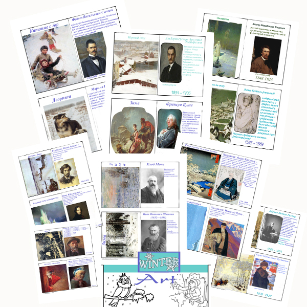 2. Кроме того, вдохновившись идеей Светы по изучению художников, нашла на просторах интернета среди зарубежных сайтов карточки с репродукциями картин и именами художников, немного переделала их : добавила других живописцев из разных стран так, чтобы охватить еще и знакомство с географией.