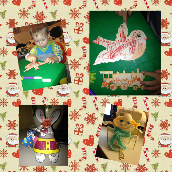6. ну и , конечно, мы мастерили игрушки на елочку: раскрашивали деревянные заготовки, клеяли бумажного зайца, сделали снеговика-лыжника.