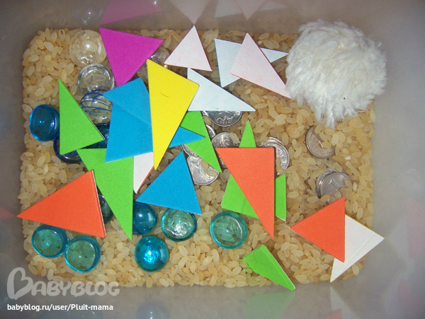 Но она не произвела на дочку впечатления. Рис (был интереснее всего остального), который она тут же стала тянуть в рот. Пришлось его убрать и фигурки переместить в нашу сенсорную коробочку с фасолью. А потом в банку со стеклянными камешками. :)) либо вообще сами по себе.