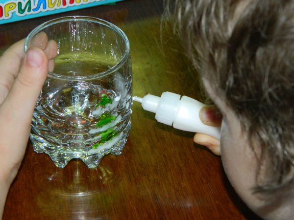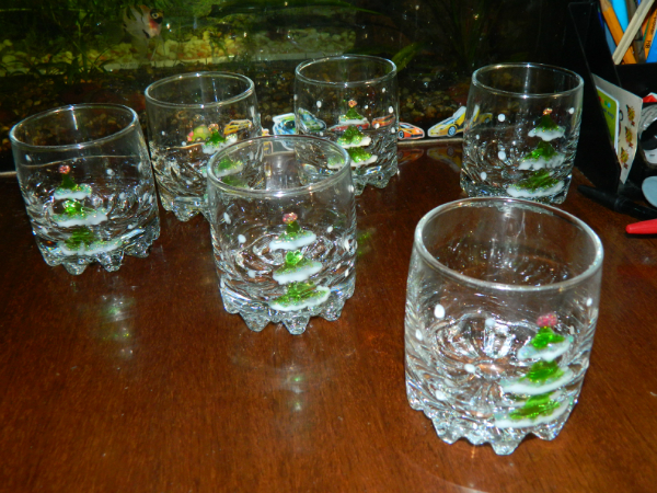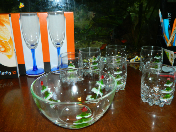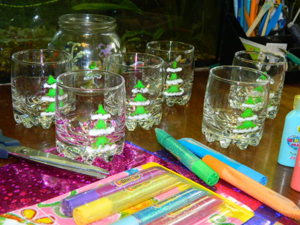 Сами. Причём прилипайки и витражные краски расчитаны для рисования на ровной и горизонтальной поверхности, а после высыхания надо будет отлепить и перенести на предмет. Но у нас сроду всё рвётся, а стаканчики имеют кругловатую форму - ровно всё равно не ляжет. А вот с ёлочками прокатило рисовать по-живому. Конечно же стали образовываться наплывы, но в случае с еловыми лапками - самое то!!!