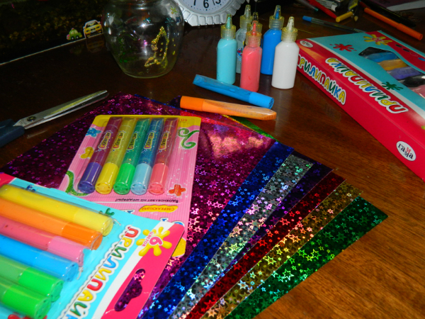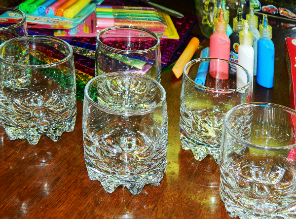 Праздник к нам пришел (Игры в День Рожденья, Новый год, 8 марта и.т.д.. А так же чем занять нескольВооружились чем смогли. Поскребли по сусекам, нашли кучу витражных и типа витражных красок с истёкающим и истёкшим сроком годности, докупили клей с блёстками. В углу - пробная банка с ракетой и узорами, нарисованными Илюшкой и мной.