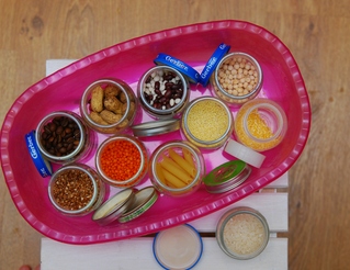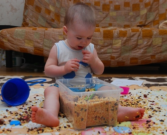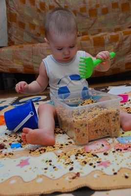 Гремелки. Насыпала в банки от пюрешек всевозможные крупы, крышки конечно туго закрутила. Еще болты-гайки хорошо греметь будут, вариантов куча, и банки пригодились. Не скажу, что деть прям в восторге был, первый раз раскидал просто, другие разы немножко посидел, погремел, поулыбался, раскидал, пособирал в мисочку... В общем, не зря.