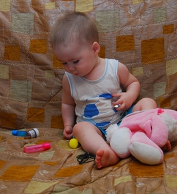 Тесто тоже лепим, сейчас уже подольше в ручках мнет, раньше прям сразу выкидывал. Показываю, что нужно пальчиком там отпечатки оставлять, формочками леплю ему, он мнет и выкидвает, или просто шарики катаю ему, показывала как туда камушки вдавливать (можно и фасолинки, но они мелкие очень), но че-то не пошли у нас, камни улетели куда-то, попробуем попозже, еще могу дать прям в баночке, он зубами крышечку открывает, и пытается достать, пальчиками отщипывает кусочки. Вчера спички втыкали, трудновато подцепить с краю палочку, он в кулочок как-то берет, но все-таки несколько раз получилось (втыкать можно и в пластилин). У нас такое тесто, не из дешевых, но там баночки большие, приятно пахнет, только вот голубой очень руки мажет, неудачный какой-то а остальные нормуль. Можно самой сделать соленое тесто, полепить и наделать из него фигурки животных, отпечатки ручек-ножек и засушить)