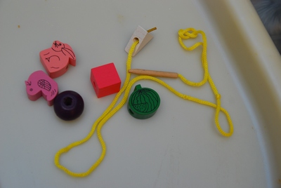 шнуровали, я есессно, Мишаня помогал как мог, и бусинки подавал и палочку вытягивал, процесс ооочень заинтересовал. Можно на кисточку нанизывать, но как-то со шнурком интереснне получалось.