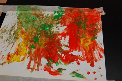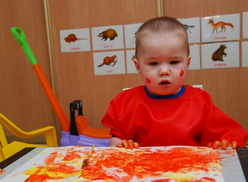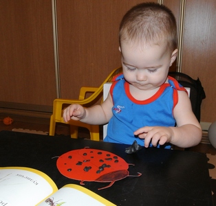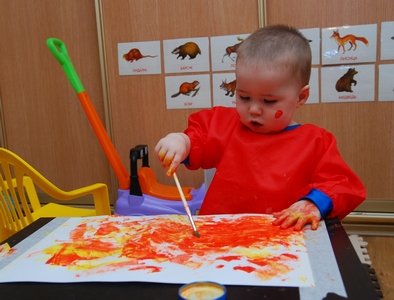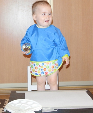 Что-то пальчиковыми красками мне совсем не нравится играться, быстро надоедает, стол отодвигает,показываю, что надо пальчиком тыкать, пальчиком не хочет, ладошкой всей размазывает. Может я не так что-то делаю? Хочу валики купить и с отпечатками попробовать, может поинтереснее будет. Раз в неделю-две обязательно рисуем, пусть привыкает потихоньку.