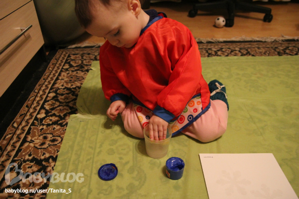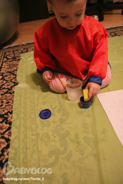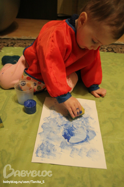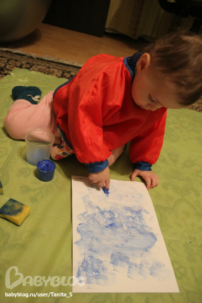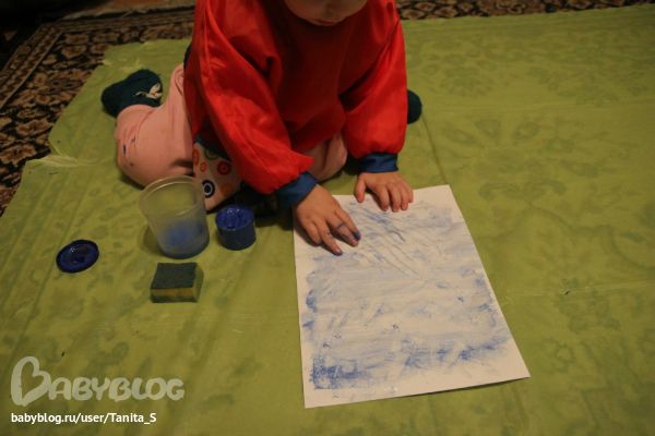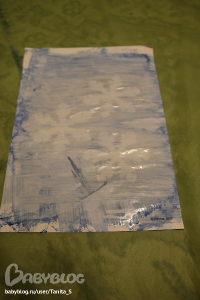 И начала возюкать ее по листу. Надо сказать, что делала она это вдохновенно. Рисовала впервые губкой и это ей понравилось. НО!!! Снежинки не хотели проявляться(((