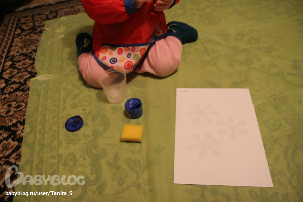Для начал взяли листик с волшебными снежинками, которые должны были проявиться при нанесении на лист краски. Краска должны была наноситься гуашь и кисточкой. А я же приготовила для Веруши губки и пальчиковые краски.