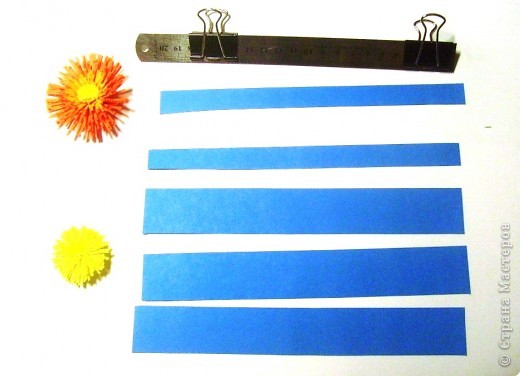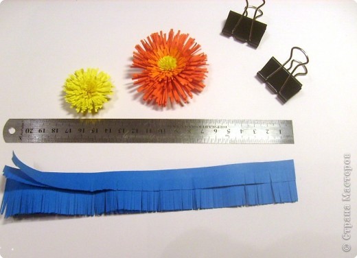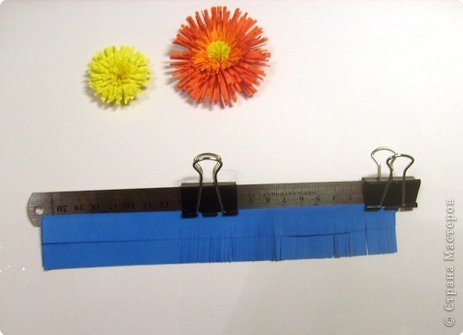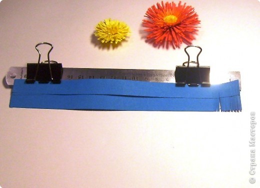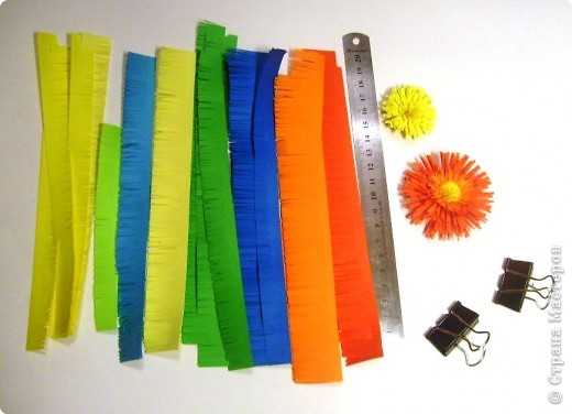 Сегодня училась резать бахрому для цветов. Собрала все идеи в кучу и решила, что для меня так удобнее. Оптимально 5 листов за раз, полоски могут быть разной ширины. Зажимы передвигать по мере надобности. Ножницы любые острые, линейка ограничивает разрез, поэтому режем серединой лезвия ножниц
