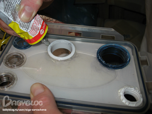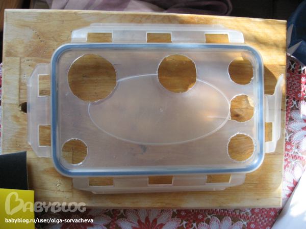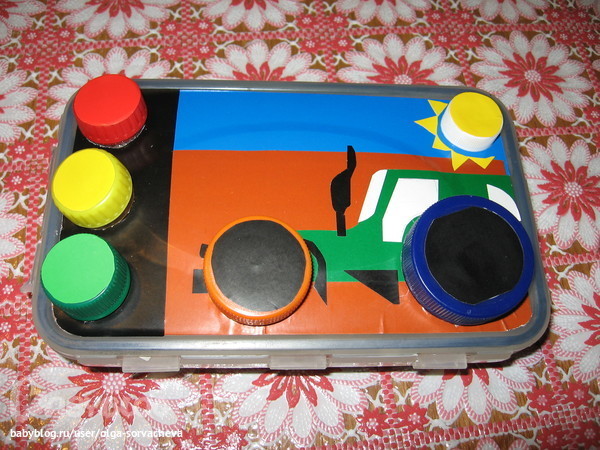 Основа - контейнер для продуктов. Собрали необходимые крышечки и срезали горлышки у пластиковых бутылок. Муж сделал вырезы ножом на крышке контейнера, смазал клеем Момент горлышки бутылок и вставил в отверстия (чтобы не прокручивались горлышки во время использования). Дали нашей конструкции подсохнуть ночь. Обклеили самоклеющейся бумагой, из нею сделали поле, небо, трактор и светофор. Готово!
