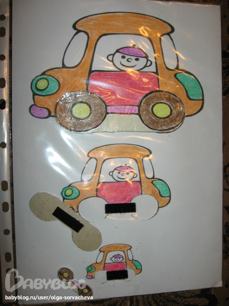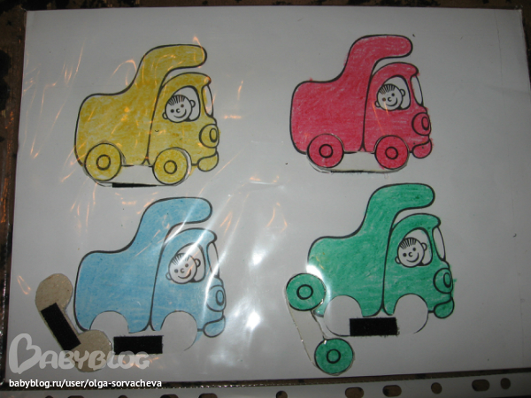 Еще игрушка-развивалка - это карточки для изучения цветов (пока основные - зеленый, синий, красный и желтый) и размеров (большой, средний и маленький). Рисунки машиной нашла в инете, раскрасила их. Вырезала у каждой машинки колеса. Колеса наклеила на картон, заламинировала скотчем. И с обратной стороны приклеила липучку. Липучки приклеила и на карточки на местах, где должны быть колеса. Перед этим карточки вложила в файлы и для прочности добавила картон с обратной стороны.