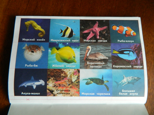 Там есть игра с карточками. Вообще обожаю книжки с играми вместе. Отдельно игра и отдельно книжка - это ей-богу не то. А так он запомнил всех морских животных. Просто целую кучу.