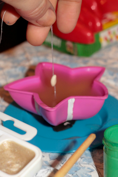 Красим ее. Лучше всего гуашь. остальные (даже брали перламутровые краски) очень бледные цвета дают (как звездочка морская получилась).
